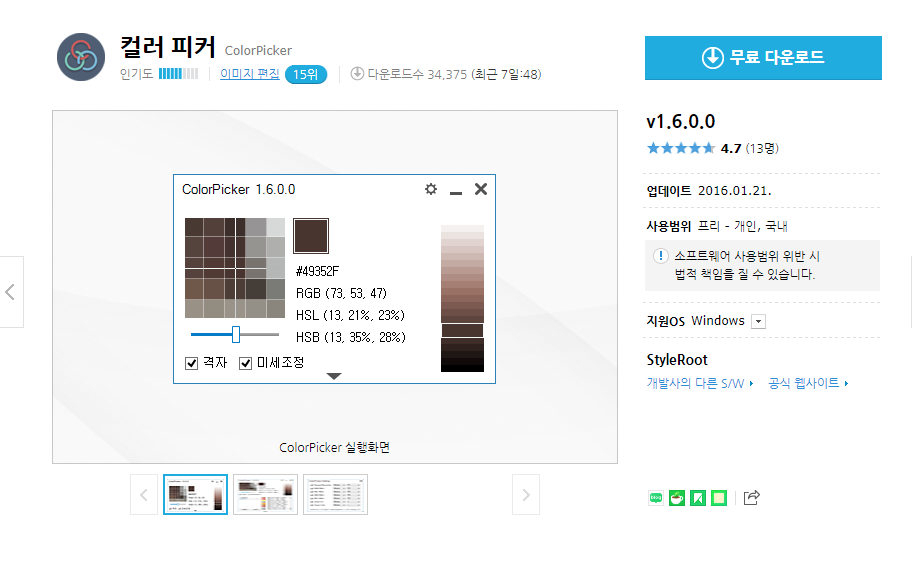 마우스위치의 색을 가져와 RGB, HEX, HSL, HSB 로 변환해주는 프로그램입니다.