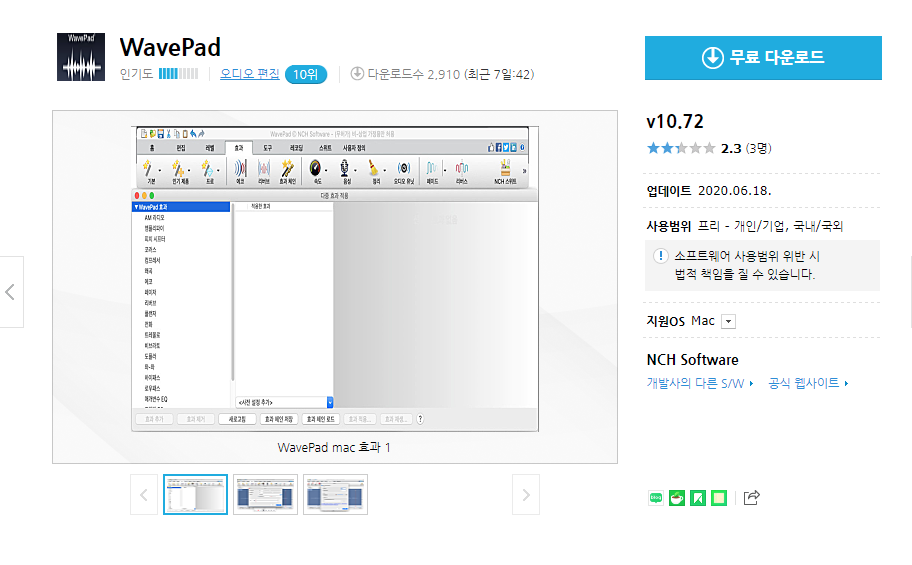 * 앰플리파이(오디오 증폭), 노멀라이즈, 이퀄라이저, 엔벨로프, 리버브, 에코, 리버스 및 음성 제거나 효과음 다운로드 제공등 다양한 오디오 효과 사용