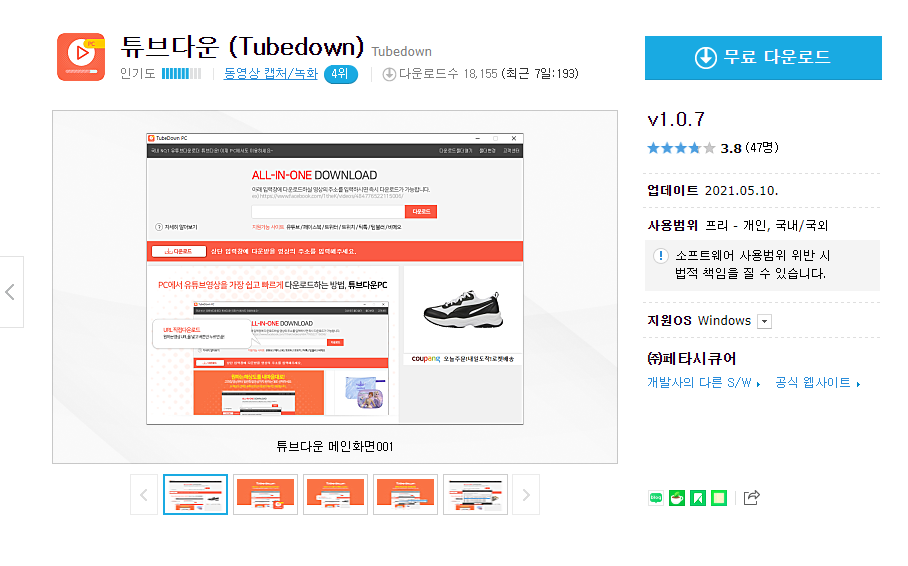 튜브다운(Tubedown) v1.0.7 무료 다운로드 (모두 다운받아 같은 폴더에 넣고 압축해제 하세요.)