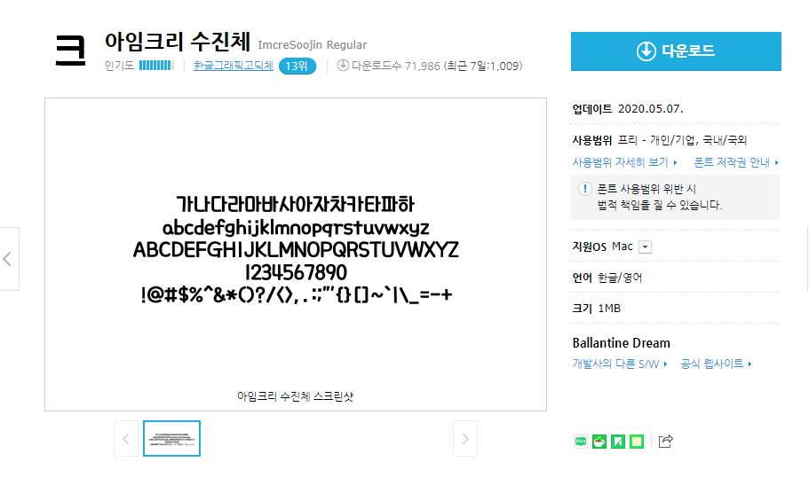 아임크리 수진체는 인쇄, 웹사이트, 영상, 임베딩, 포장지부터 BI/CI 등 비상업적, 상업적 용도로 사용 가능한 발렌타인드림의 무료서체입니다.