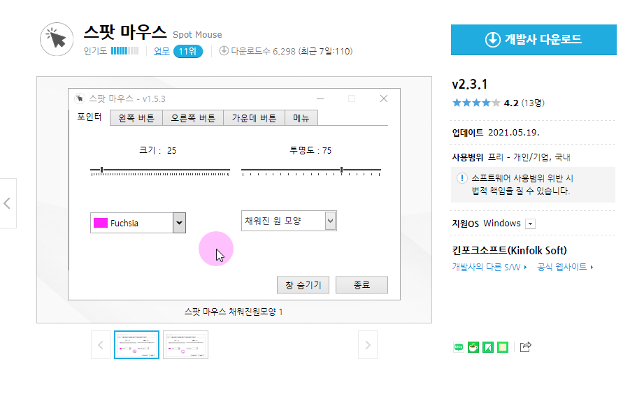 마우스 포인터 주변에 동그란 하일라이트, 강조표시 해주는 프로그램입니다. 클릭시 버튼별로 하일라이트가 표시됩니다. 동영상, 온라인 강의시 마우스 위치를 강조할때 사용합니다.