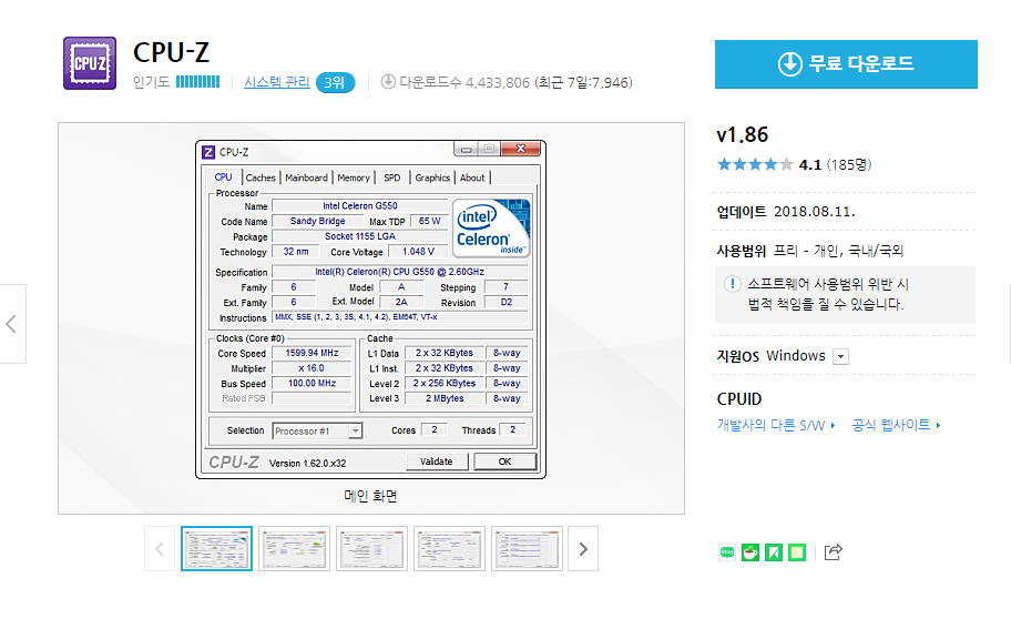 마더보드의 상세 정보 및 L1, L2, L3 캐쉬 정보를 제공합니다.