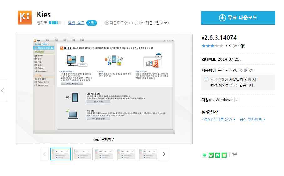 사용하시는 모델에 따라 해당하는 Kies의 버전이 다르오니, 반드시 지원 모델을 확인한 후 설치하세요.