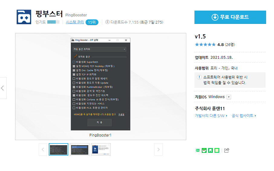 사용자가 게임을 할때 느리다면 PingBooster를 이용해서 인터넷 환경을 최적화 시켜서 게임 속도를 올려거나 사용자 PC가 느려졌다면 최적화된 PC환경을 제공합니다.